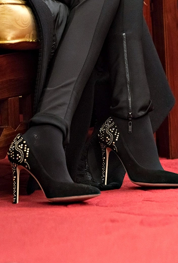На приеме в Diaoyutai State Guesthouse Брижит продемонстрировала похожий наряд, состоящий из длинного черного пальто от Louis Vuitton, блузы, расшитой золотистым люрексом, кожаных брюк и черных лодочек, украшенных — барабанная дробь! — золотистыми стразами.