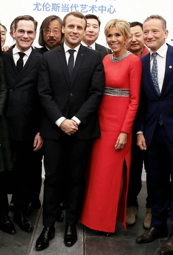 Во время своего визита в Ullens Center for Contemporary Art в Пекине 10 января, французская первая леди выбрала максимально нетипичный для нее, но отвечающий дипломатическим задачам дресс-кода наряд. Вечернее красное платье Louis Vuitton, украшенное двумя симметричными разрезами по бокам, она дополнила легким черным пальто, декорированным вышивкой из кристаллов.