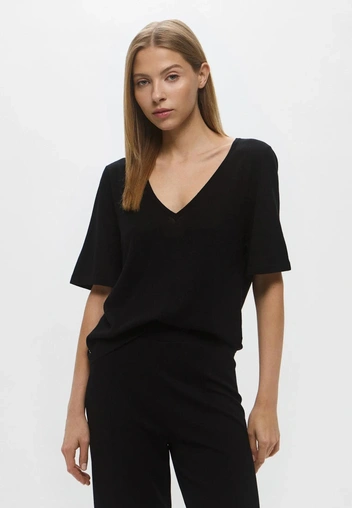 Лаконичный круглый или V-образный вырез: первый — для более расслабленных и кэжуал-сочетаний, второй — когда нужен чуть более собранный и офисный нижний слой.