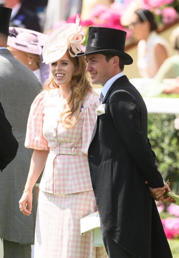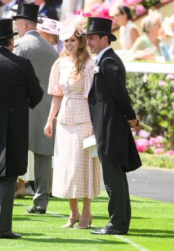 Принцесса Беатрис отправилась на Royal Ascot 2025 в компании мужа Эдоардо Мапелли-Моцци. Она надела розово-белый костюм в клетку с рукавами-фонариками. На талии верх ее наряда затягивался ремнем и создавал подобие баски. К своему образу королевская особа также добавила бежевые туфли Jennifer Chamandi, шляпку с бантом Juliette Botterill и небольшую белую сумку Anya Hindmarch.