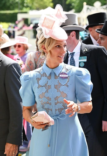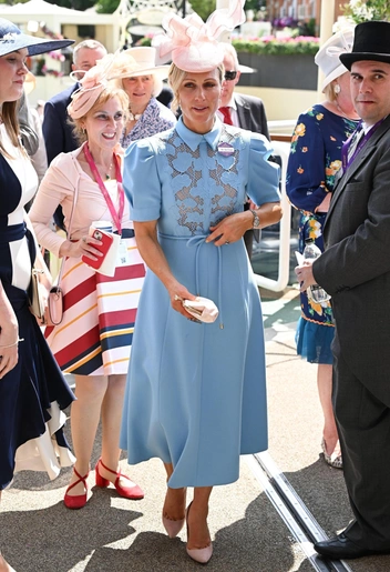 Зара Тиндалл в этом году посетила Royal Ascot в платье небесно-голубого цвета дизайнера Rebecca Vallance. Нежный наряд с пышными рукавами и юбкой А-силуэта был подпоясан шнурком в тон, а на груди — украшен деталью из кружева.