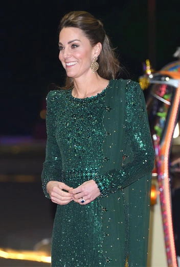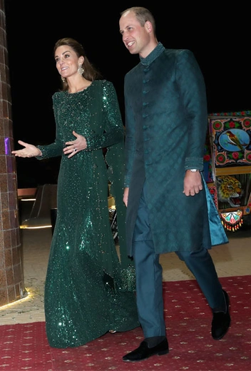В этом году у Кейт и Уильяма была запланирована масштабная зарубежная поездка – с 14 по 18 октября монаршая чета гостила в Пакистане. Герцогине, конечно, понадобилось немало нарядов, которые уместно смотрелись бы в туре (читайте также: Все наряды герцогини Кейт в туре по Пакистану). В один из дней она примерила роскошное платье в пол, усыпанное пайетками. Оттенок платья Jenny Packham дублировал цвет флага принимающей стороны. Интересно, что принц Уильям в тот вечер примерил национальный костюм шеврани, который традиционно надевают на торжественные мероприятия.