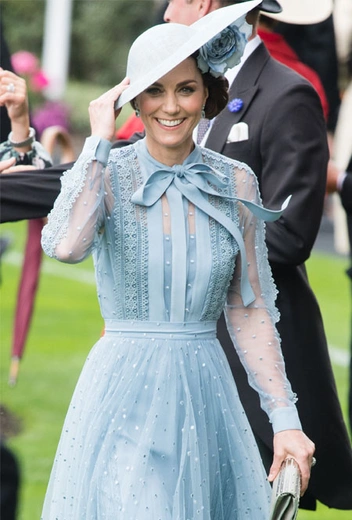 На одном из самых важных событий в Великобритании – королевских скачках в Аскоте – есть свой особенный дресс-код. Например, женщинам обязательно появляться в шляпках. Герцогиня Кейт дресс-код, конечно, никогда не нарушает, но в этом году решила показать, каким на самом деле современным и стильным может быть протокольный наряд для Royal Ascot. Перед публикой Кэтрин появилась в изящном нежно-голубом платье с кружевом от Elie Saab, которое она дополнила цветочной шляпкой Philip Treacy.