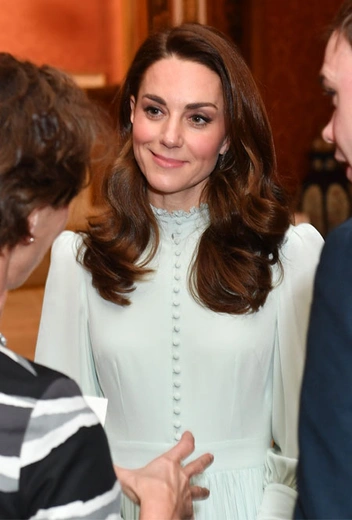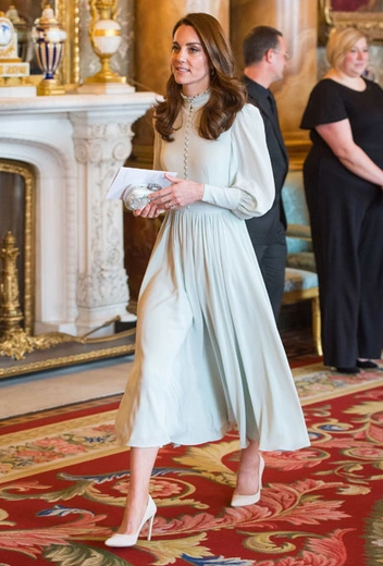 Образы в пастельных тонах получаются у Кейт ничуть не хуже – хотя их она нередко обходит стороной, предпочитая броские и яркие краски. В марте в Букингемском дворце дворце состоялось празднование 50-летия инвеституры принца Чарльза. Кейт выбрала нежно-голубое платье в викторианском стиле с рядом пуговиц и дополнила наряд нюдовыми лодочками Emmy London. Споры о том, кто же на самом деле был автором наряда, велись долго, но в итоге аналогичное платье нашлось в коллекции российского бренда Ulyana Sergeenko.