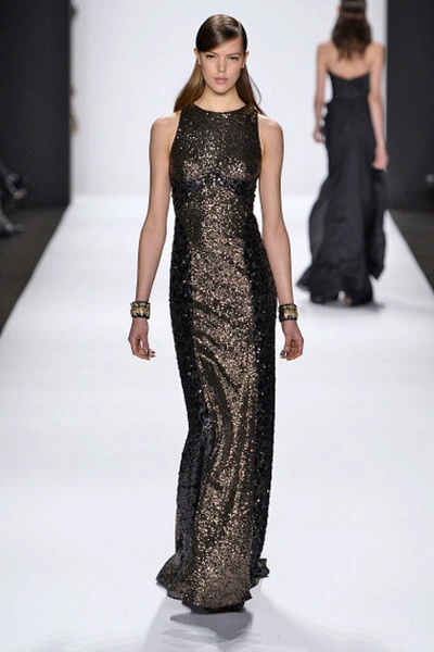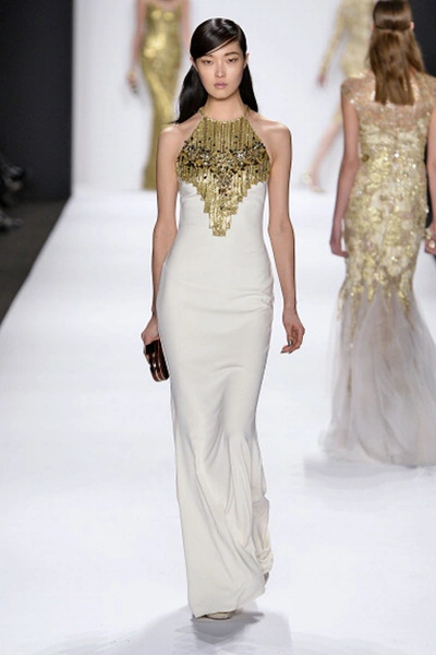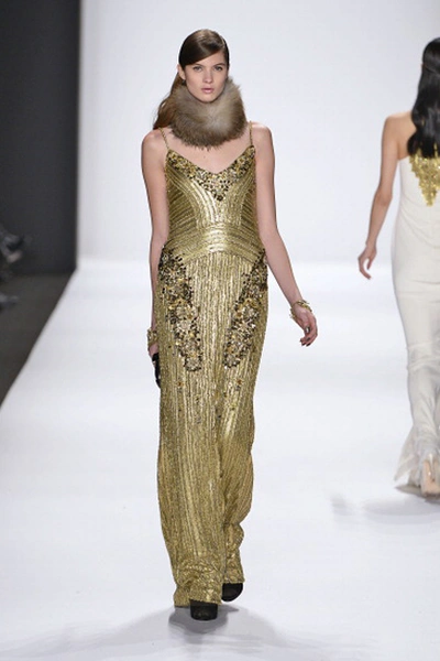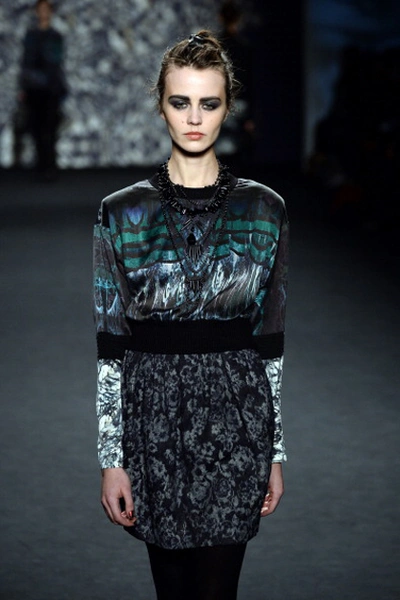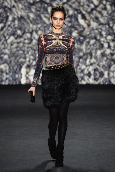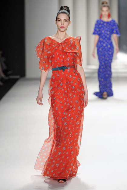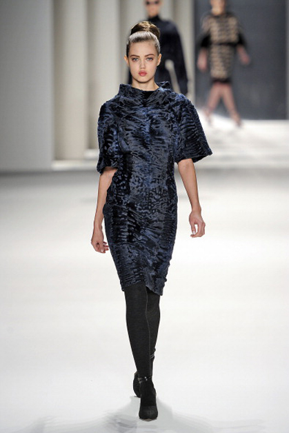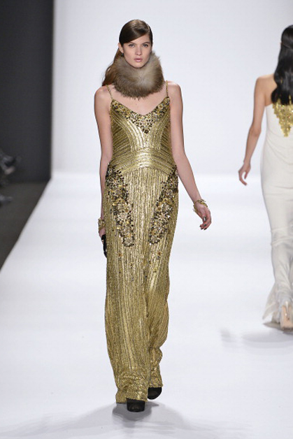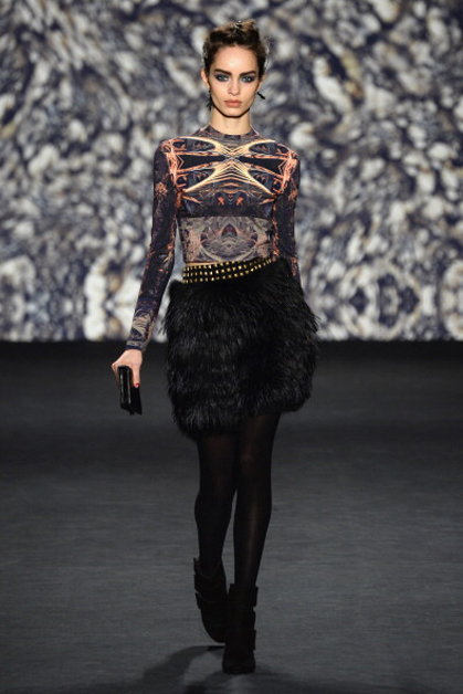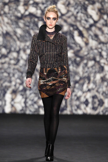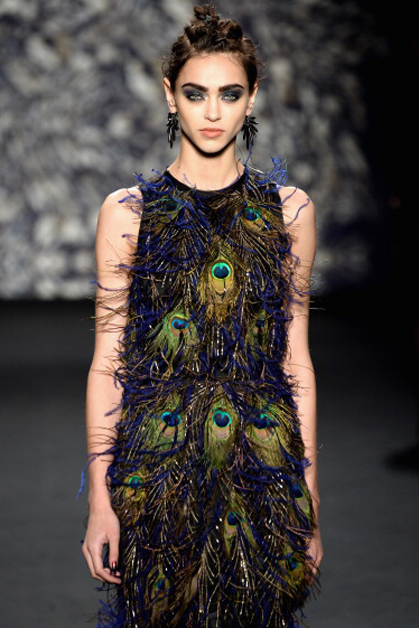 В осенне-зимней коллекции Nicole Miller, как и всегда, преобладали сложные принты в этническом стиле и вышивка. Особое внимание на показе заслужило платье, полностью покрытое павлиньими перьями.