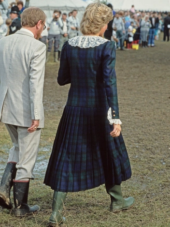 Позже принцессу Уэльскую видели в тех же зеленых сапогах, когда она пробиралась сквозь грязь к месту обозрения Хайлендских игр на острове Бьют. На Ее Высочестве было романтичное платье в клетку Blackwatch с белыми кружевными воротником и манжетами. Добравшись до сухой лужайки, Диана сменила сапоги на классические туфли на крошечном каблуке.