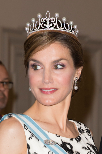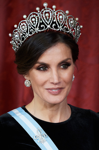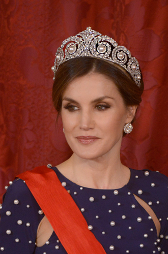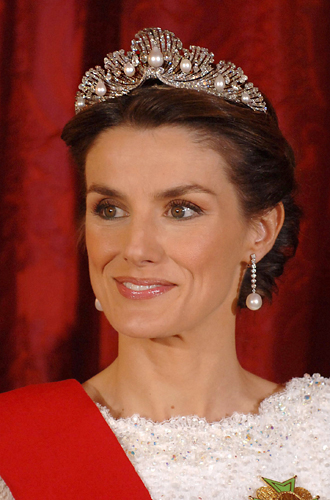 Это украшение слывет еще одним любимчиком королевы Софии, однако в 2018 году эта тиара дебютировала как убранство новой королевы. Диадема была изготовлена Cartier для королевы Виктории Евгении (жены короля Альфонса XIII, прабабушки Филиппа VI). В оригинальной версии жемчужины можно было заменить на изумруды, однако после изгнания королевская семья продала самоцветы. Как тиара попала к Хуану Карлосу, до сих пор ведутся споры. Самая популярная версия гласит, что король выкупил ее у своей тети.