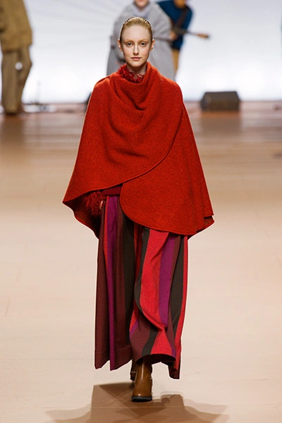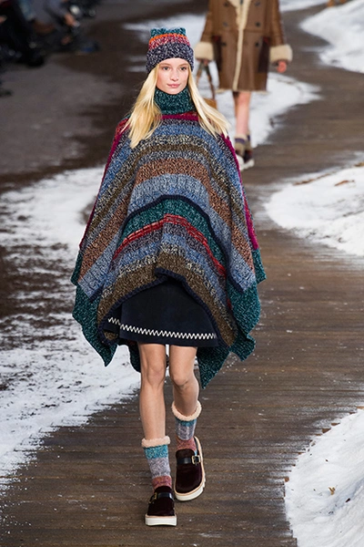 Чтобы отдохнуть от жакетов и пальто, в качестве верхней одежды сейчас можно надевать пончо. Вариантов масса: похожие на плед, вязаные, с рисунком или с бахромой. На показах Burberry и Etro они играли ключевую роль. Стиль не обязательно фольклорный, тем более что он не всем идет. Пончо – одежда удобная, как одеяло, в нем приятно спать в самолете. И его можно носить с другой очень актуальной в этом сезоне вещью – ботфортами, как предлагалось на показе Roberto Cavalli и как делают Оливия Палермо и Елена Перминова.