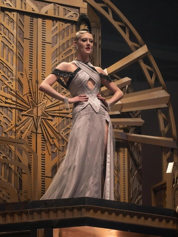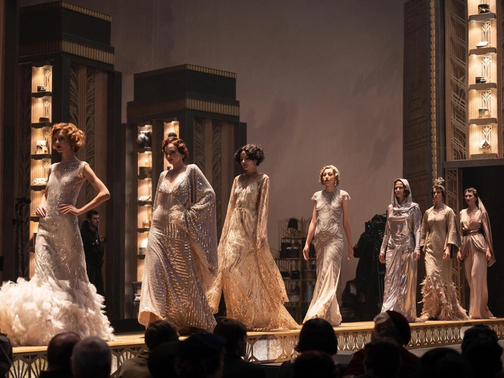 Кутюрные платья, украшенные серебристыми нитями, страусиными перьями и сверкающими камнями, вдохновлены искусством: от исторических и современных коллекций Chanel, Elie Saab, Zuhair Murad, Badgley Mischka, Elisabetta Franchi, Tony Ward, Georges Hobeika до немого кино, журналов мод 30-х годов и художественных работ Эрте.