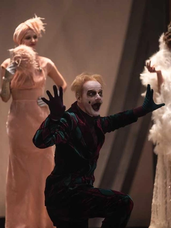 Азазелло же в Варьете напоминает Пьеро — грустного клоуна: подтекший грим, высокий темный колпак. В других сценах Галя создавала ему воинственный, нечеловечески сильный внешний вид: шрам на лице, искаженная асимметричная фигура с небольшим горбом, ярко выраженные мускулы.