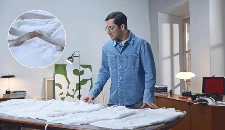 В первую очередь нужно изучить материал, советует Алеко в новом выпуске своего шоу. Лучше всего выбирать изделие из натуральных тканей. Самым выигрышным сочетанием будет смесь хлопка или льна с шелком. Синтетические материалы в составе тоже вполне допустимы, они делают рубашку более эластичной. Главное правило — любой материал, будь то хлопок или эластан, должен быть качественным, иначе вещь быстро придет в негодность.