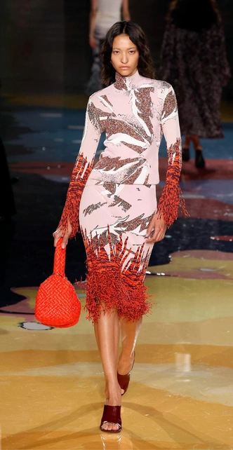 Справедливости ради, волну «боттегомании» еще в конце 2010-х запустил Дэниел Ли — именно под его руководством весь мир захотел носить Pouch и Cassette, переобулся в ботинки-челси и туфли с квадратным носом. Но после его ухода в 2021-м и назначения Блази, Дом не потерял марку, а лишь стал держать ее крепче. Матье ставил на новые техники, много работал с кожей и культовым плетением Intrecciato, усложнял даже самые простые вещи, вплоть до джинс, и использовал все больше ярких фактур — теперь ставших его фирменным приемом.