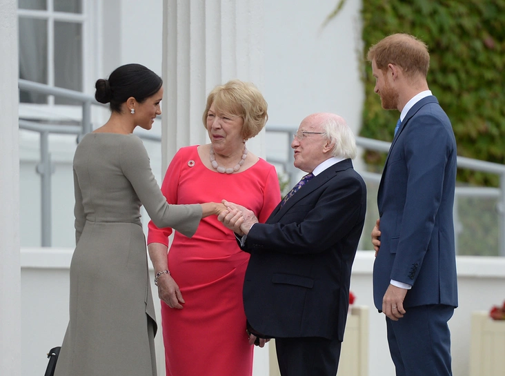 Второй (и последний) день заграничного тура Гарри и Меган по Ирландии начался с весьма важного и формального мероприятия – с встречи с президентом и первой леди страны, Майклом и Сабиной Хиггинс, в их резиденции в Феникс-парке. И если первая леди Ирландии выбрала для мероприятия ярко-розовый наряд (кстати: «Почему жены влиятельных мужчин выбирают один цвет в одежде»), то герцогиня Сассекская решила обратиться к типичным канонам классического power-dressing: строгое платье серо-зеленого цвета, классическая черная сумка Fendi, остроносые лодочки и строгий низкий пучок.