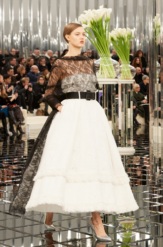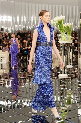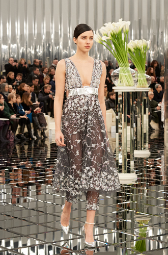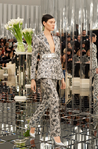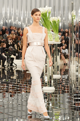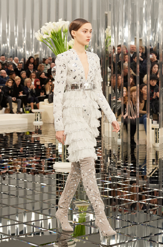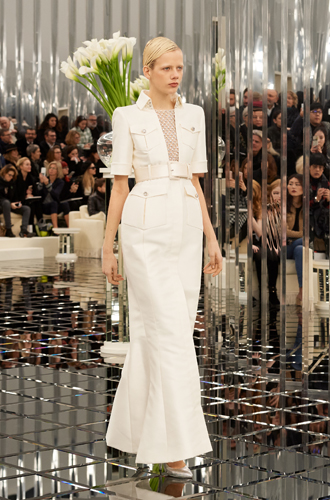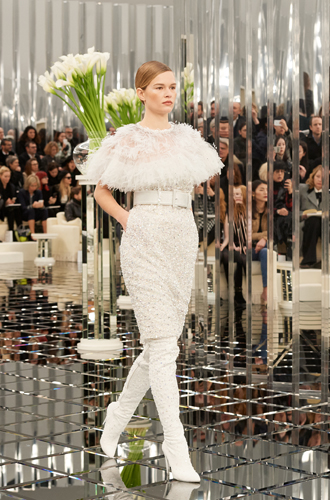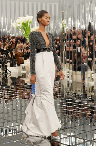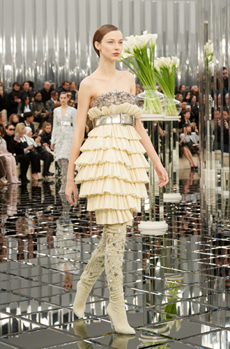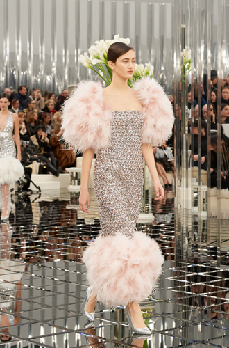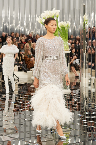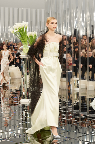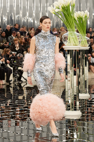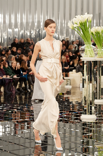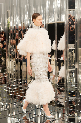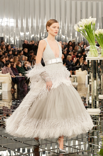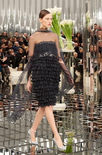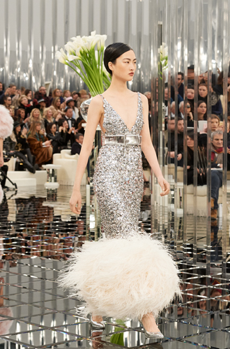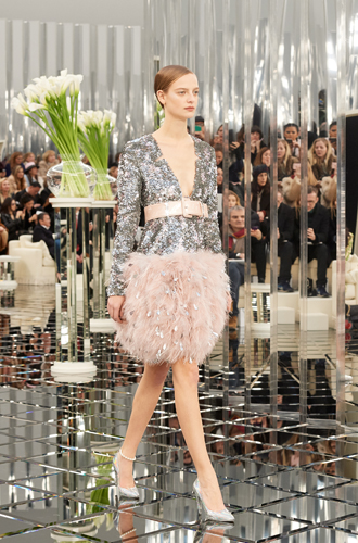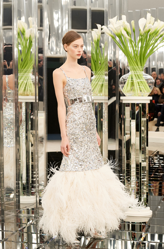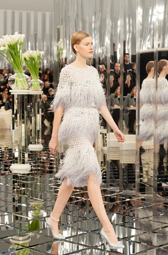 Но это лишь обманка. Если приглядеться, соблазну и сексуальности места здесь нашлось предостаточно. Основным источником вдохновения для Карла Лагерфельда на сей раз стали 20-е ─ отнюдь не целомудренная эпоха. Вспомнить об эмансипированных, жадных до утех и развлечений флэпперах заставляют облегающие силуэты длинных вечерних нарядов и обилие бахромы, напоминающей страусиные перья.