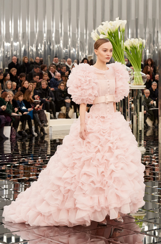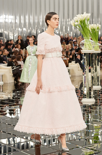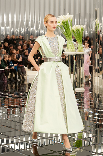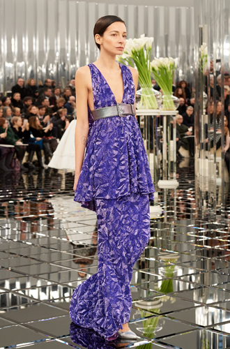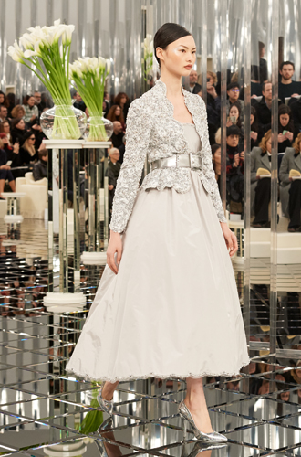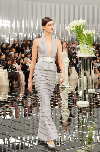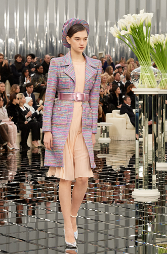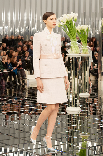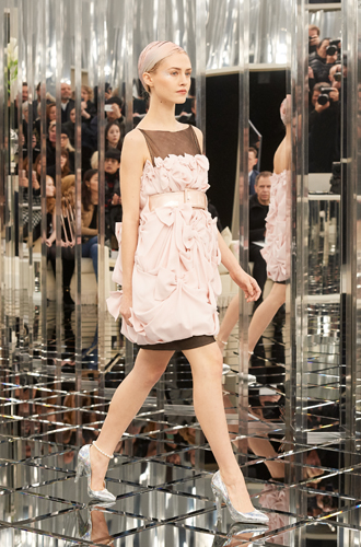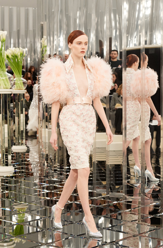 Чистые пастельные оттенки, блестящие серебристые ткани, шляпки, сдвинутые на затылок и напоминающие нимб. И все это в поразительных декорациях – огромные зеркала и светло-бежевые кожаные диваны. Кажется, эта коллекция прославляет свет, чистоту и непорочность во всех проявлениях.