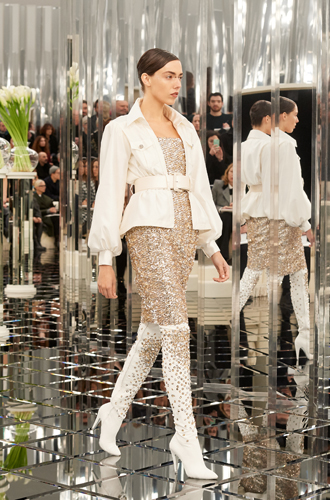 Лагерфельд не был бы гением от мира моды, если бы ограничился отсылками лишь к одной эпохе. В коллекции есть «оммаж» и 50-м с их пышными длиной до шиколотки, юбками, и 60-м с соблазнительными блестящими ботфортами и, разумеется, провокативным 80-м – за них здесь отвечают широкие блестящие ремни, облегающие брюки с пестрым принтом и графичные жакеты с жесткой линией плеч. В общем, почти весь ХХ век как на ладони, а уж в нем порока было намного больше, чем святости.