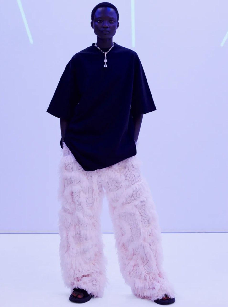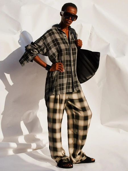 К слову о комфорте. В этой коллекции именно он зачастую стоит на первом месте. Отсюда — и «пижамные» клетчатые костюмы, и оверсайз-футболки, и объемные, обволакивающие плащи, в которых не страшна никакая плохая погода.