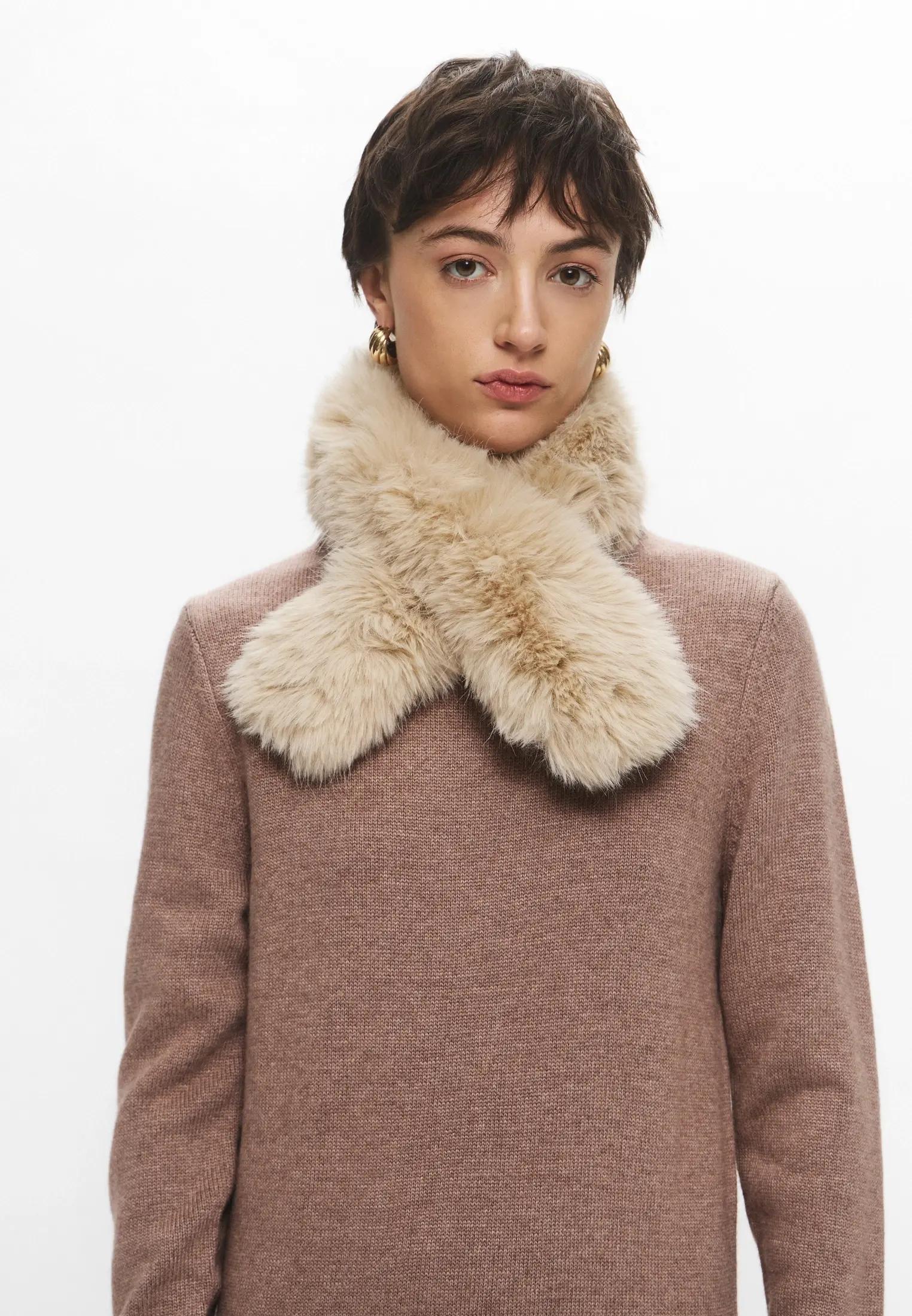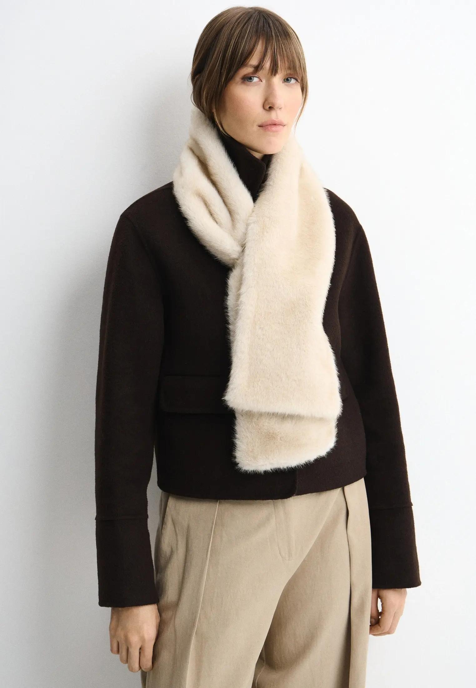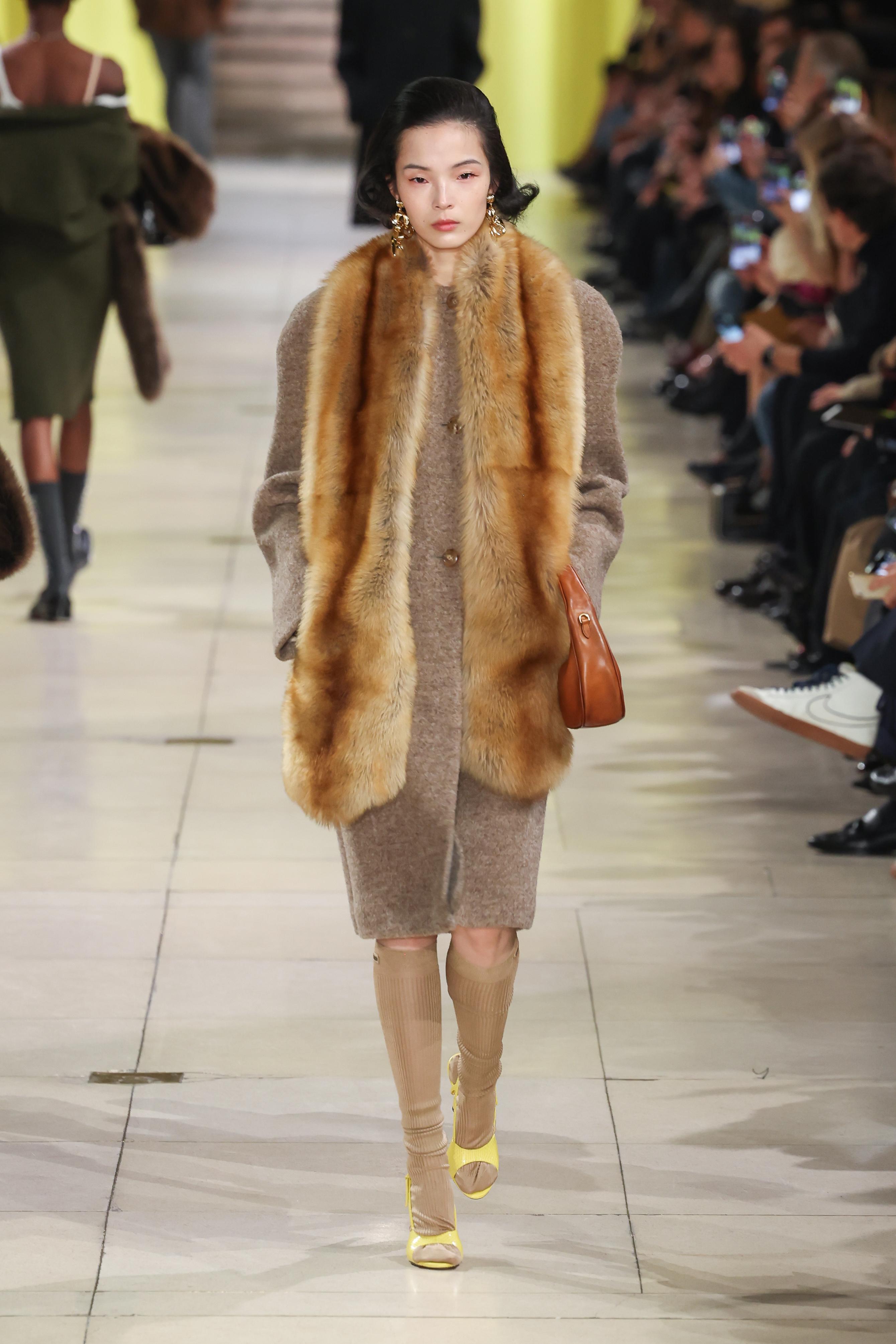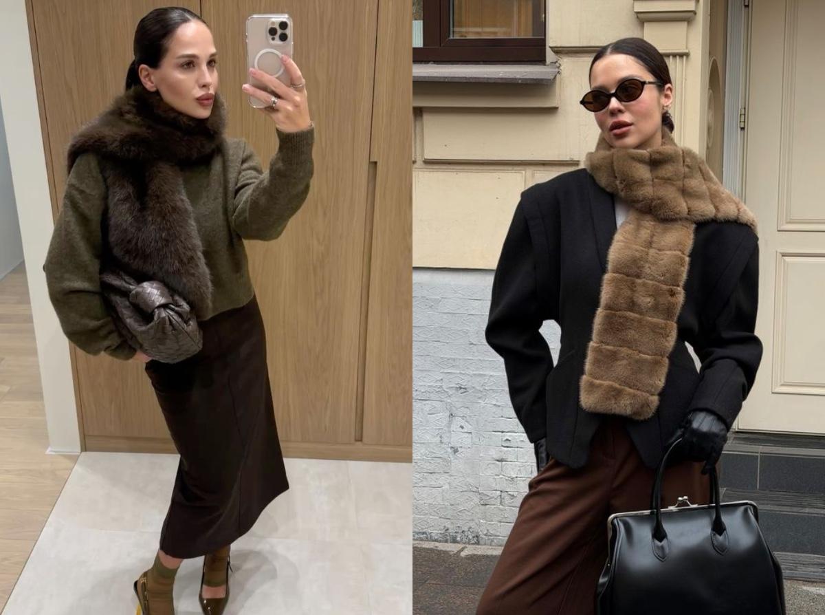 Меховые шарфы. На показах Prada и Elie Saab появились широкие, объемные шарфы и палантины — их носили поверх жакетов, пальто и даже трикотажа, часто в ярких или насыщенных оттенках.