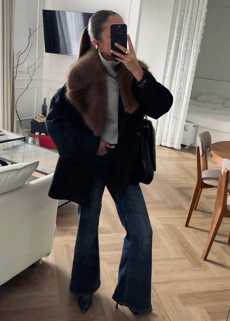 В дуэте с денимом: один из самых стильных и универсальных приемов — сочетать объемную меховую горжетку с любимыми джинсами. Такой аутйит сразу балансирует между расслабленностью и шиком: мех добавляет образу роскоши, а деним — небрежной повседневности. Дополните аутфит базовым свитером, массивными ботинками или ботильонами на каблуке, чтобы лук стал завершенным и более актуальным для нашей зимы (читайте также: Какой он — идеальный базовый свитер: 33 лучших варианта у российских брендов).