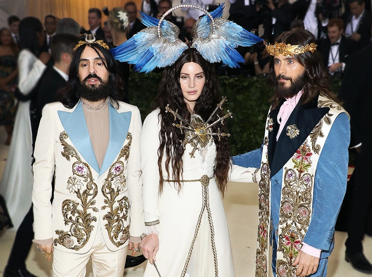 Образ Ланы дель Рей получился крайне спорным, а многие издания включили его в список худших нарядов всего вечера. Однако в нем певица очень гармонично смотрелась рядом с другим поклонником марки Джаредом Лето, компанию которым составил еще и творец всего этого великолепия Алессандро Микеле.