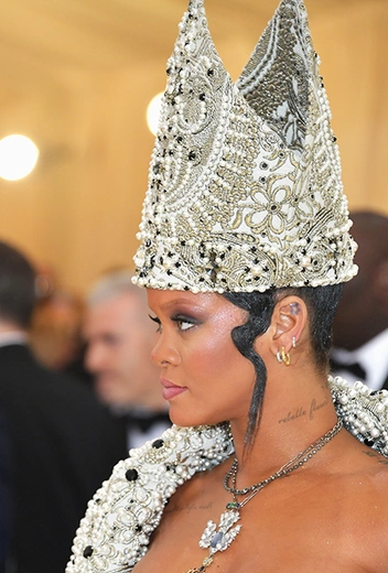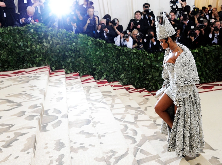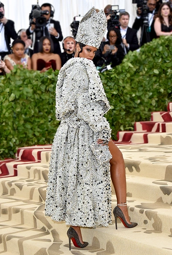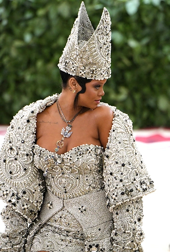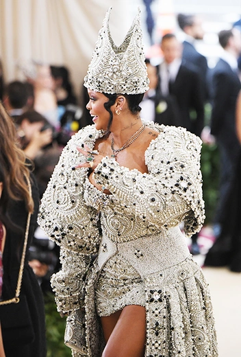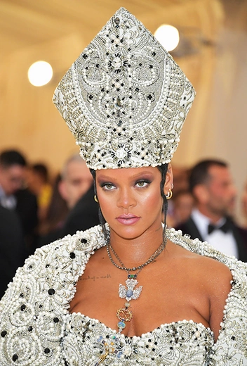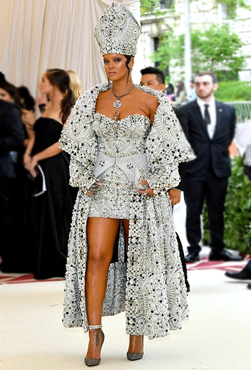Наряд Рианны состоял из трех частей: мини-платья, плаща и митры. Все они были украшены золотой вышивкой, крупными стразами и сотнями мелких жемчужин. Митра на голове Рианны вызвала стойкие ассоциации с митрой самого Папы римского: так певица ненавязчиво намекнула, кто все-таки правит этим Балом. В качестве аксессуаров — серые лодочки от Christian Louboutin, массивное колье и жемчужные браслеты на ногах.