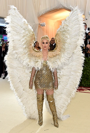 Если Рианна в этот вечер изображала Папу римского, то Кэти Перри — ангела: певица появилась в золотистом мини и в золотистых ботфортах, главными украшениями которых стали огромные белые крылья.