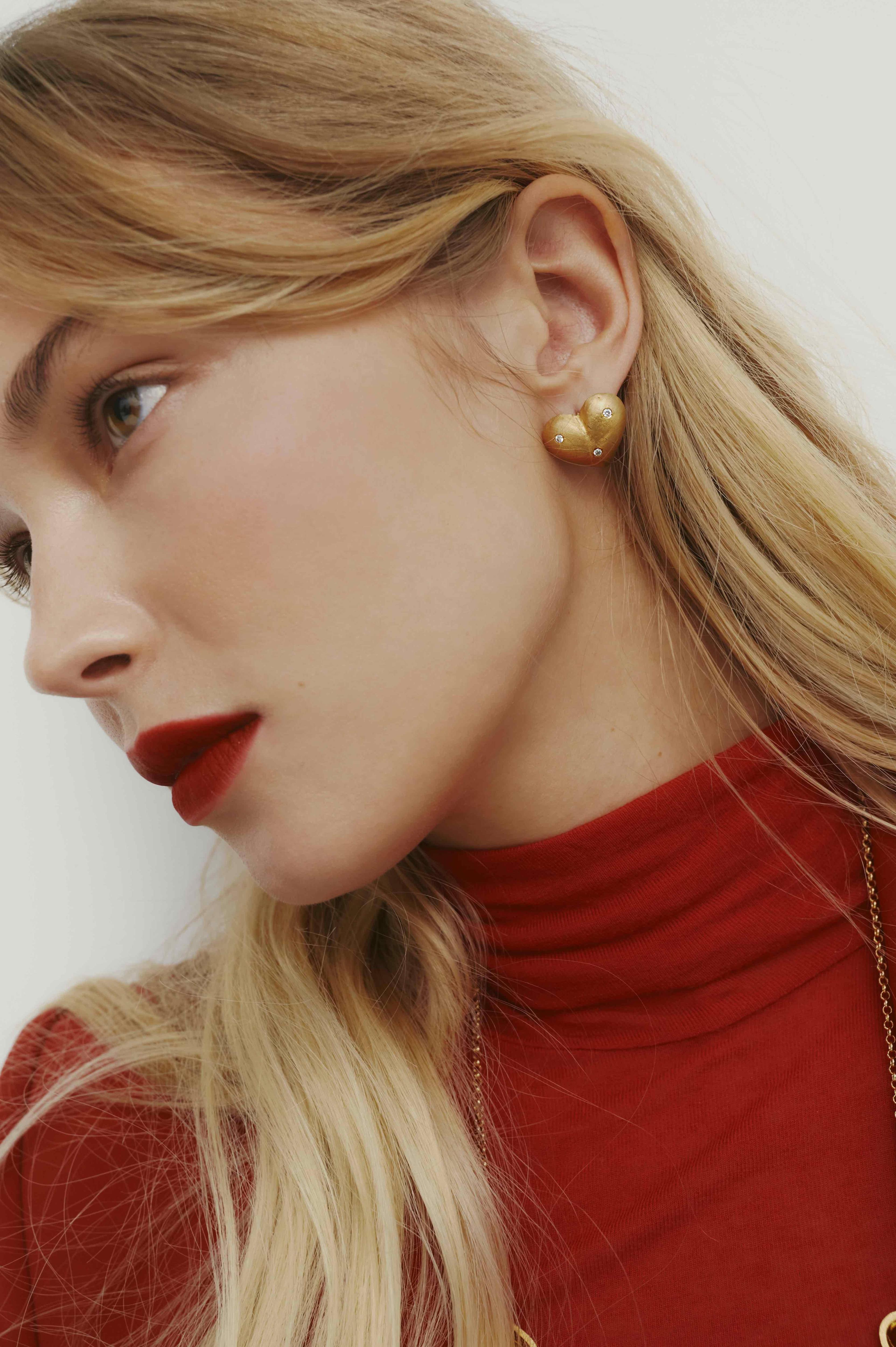 Такие серьги впишутся и в романтический, и в повседневный образ, за счет своего лаконичного дизайна. А в День Святого Валентина предлагаем сочетать украшение с ярко-красными губами для праздничного настроения.