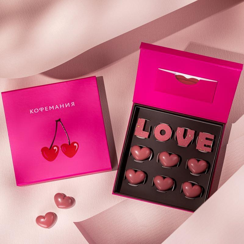 Для тех, кто хочет 14 февраля порадовать любимых, шеф-кондитер «Кофемании» Елена Железнякова приготовила подарочный набор конфет ручной работы. В него вошли шесть конфет в виде сердец: «Амарена» с вишневым ганашем и цельной вишней, и четыре шоколадные буквы, образующие надпись LOVE. Конфеты упакованы в стильную розовую коробку и дополнены фирменной открыткой.