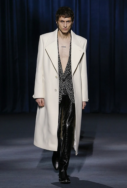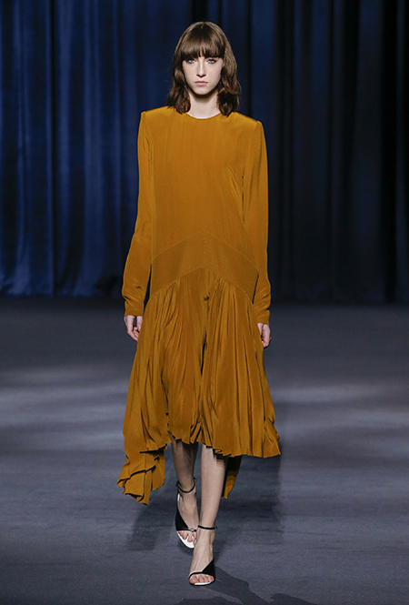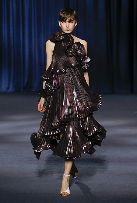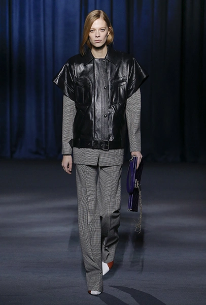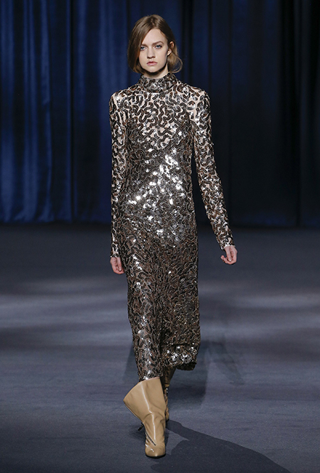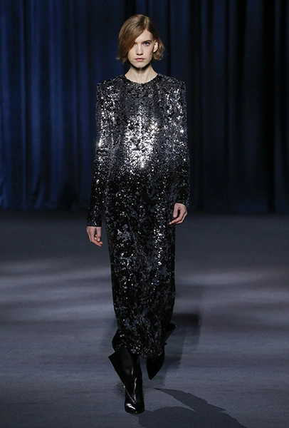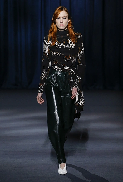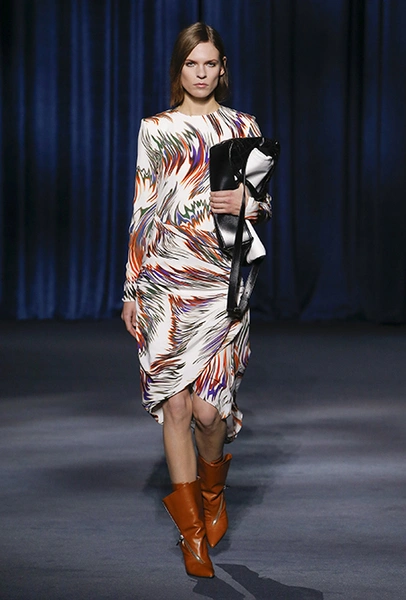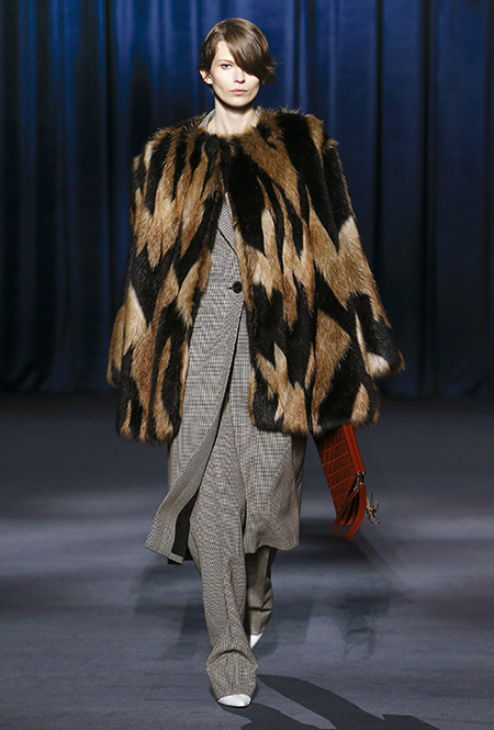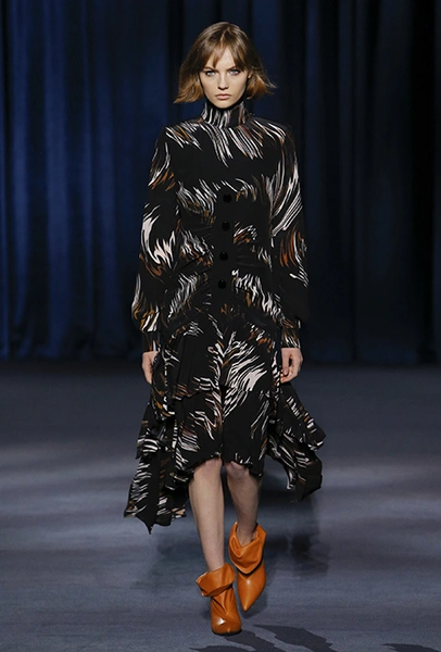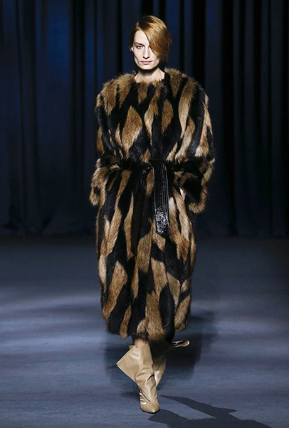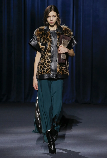 В целом же, от коллекции остается впечатление некой усредненности. Обилие меха и кожи, блеск, баски, леопард и местами яркий, психоделический принт. Да, это дорого. Да, «богато» и местами даже роскошно. Но где здесь оригинальность, где индивидуальный голос самой Клэр Уэйт Келлер – на самом деле, талантливого и самобытного дизайнера? О ее собственном, ни на что не похожем стиле, напоминают разве что несколько платьев, показанных ближе к концу шоу, – многоярусные, из блестящей ткани с крупными, неправильной формы оборками. Рюши и воланы Клэр любила всегда, это мы помним еще по ее периоду в Chloé. Она как никто умеет работать с этим «материалом» и удачно такие детали обыгрывать. Те самые платья стали очередным тому подтверждением. Будем надеяться, что в дальнейшем Уэйт Келлер сумеет найти баланс между необходимостью возрождать годы модного дома «с историей» и стремлением воплощать собственные оригинальные идеи.