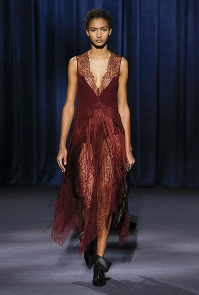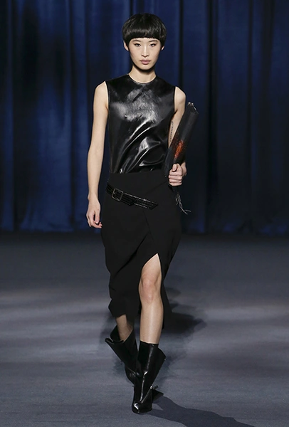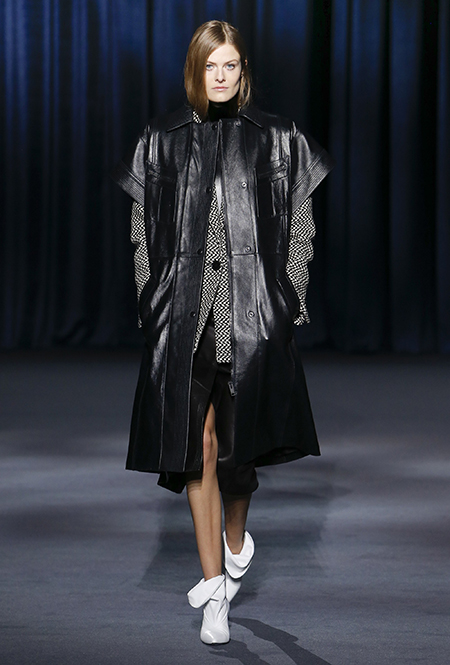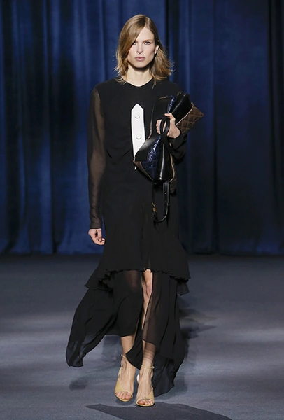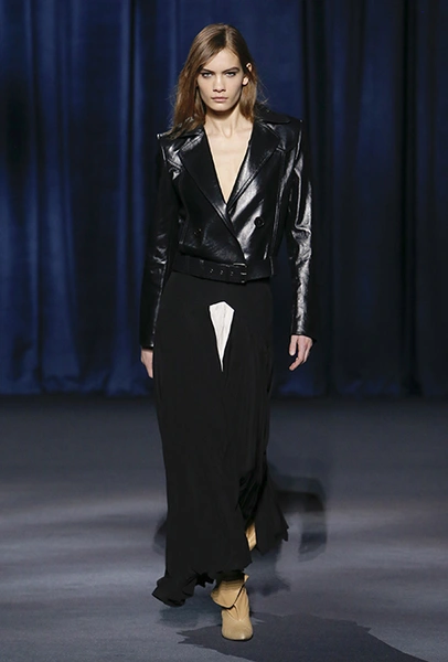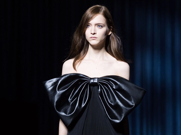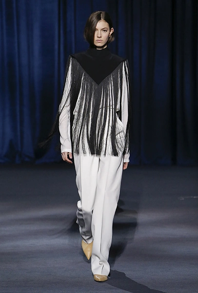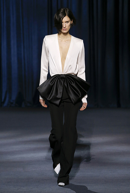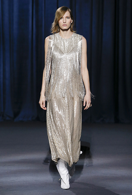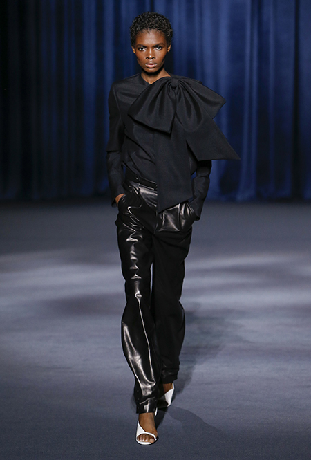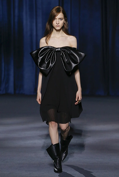 Кожи в коллекции тоже много. Жакеты, пальто, сапоги – все это, само собой, здесь есть. Но больше всего запоминается огромный кожаный бант, которым украшен лиф короткого коктейльного платья. Это вновь отсылает к теме «классики гламура» – то, с чем привыкли ассоциировать Givenchy. Вдобавок к наряду с бантом, здесь есть и блестящие серебристые туалеты в стиле 20-х годов, и платья с бахромой и вставками из черного кружева. Если не все, то, по крайней мере, часть из них мы наверняка увидим на красных дорожках – Givenchy любят знаменитости первого эшелона, и это тоже отличительный знак бренда.