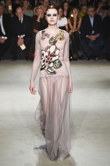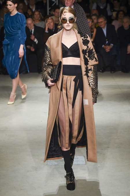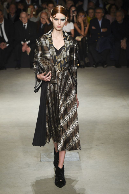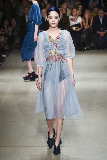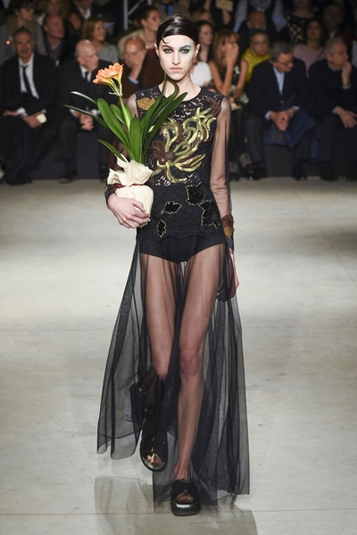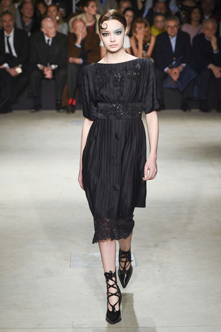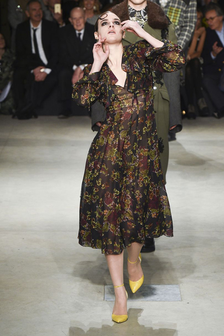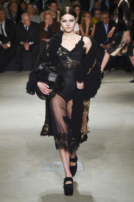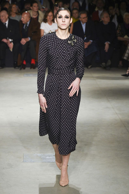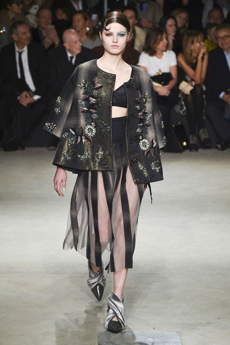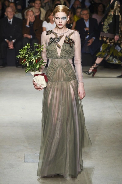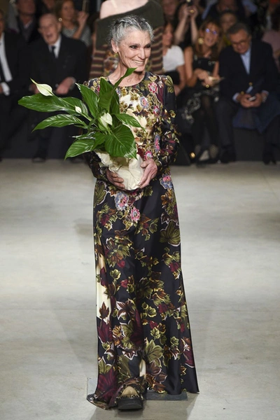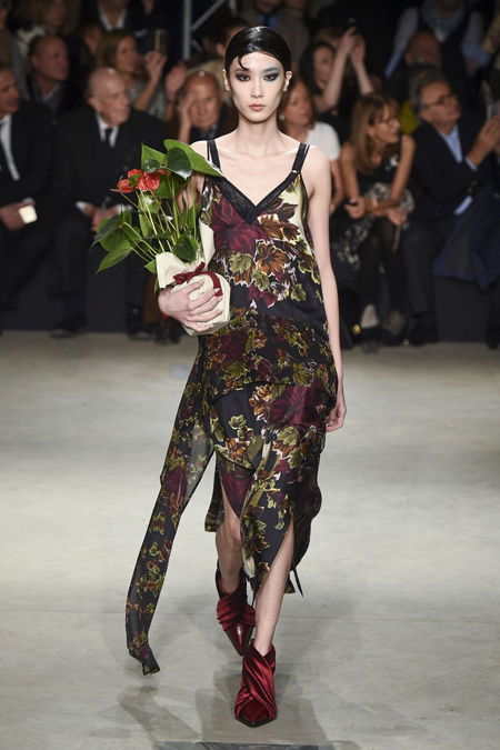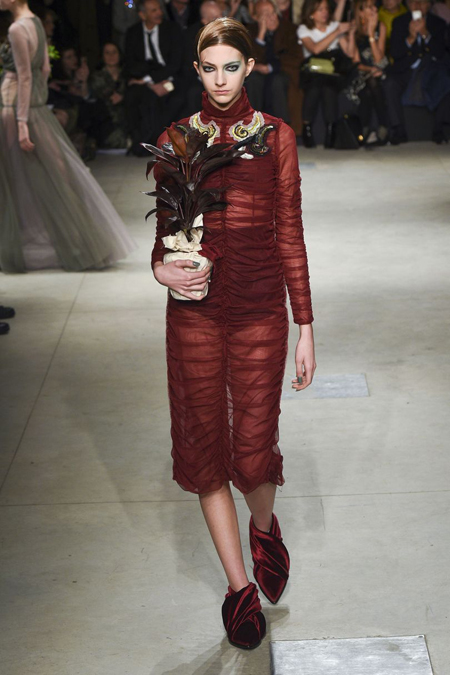 Две главных музы на показе дизайнера – известная итальянская женщина-ботаник Эва Мамели (в честь нее модели несли горшки с живыми растениями) и легендарная танцовщица и хореограф Пина Бауш. Прически женщин на подиуме были вдохновлены именно стилем Пины – собранные назад, гладко уложенные волосы и спадающий на лоб тонкий завиток.
