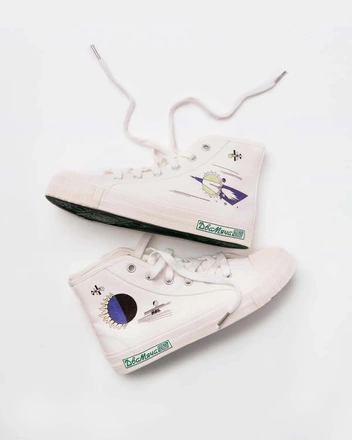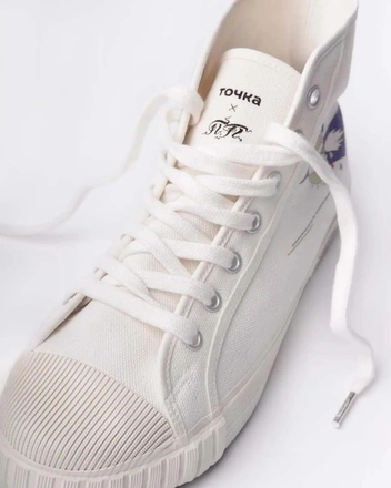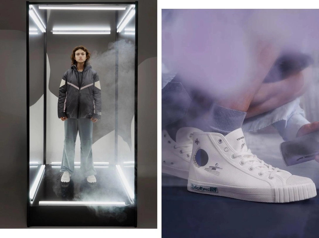 Универмаг банка «Точка» выпустил коллаборацию с российским брендом обуви «Два мяча» и художником Павлом Пепперштейном. Главной темой стал космос: устремленный прочь от земного шара корабль на одном из кед олицетворяет несгибаемый дух людей, которые привыкли действовать, а не ждать. Солнечная корона на втором подчеркивает их особую роль в устройстве мира. В коллаборации использовали легендарную модель кед, история которых длится с 1965 года.