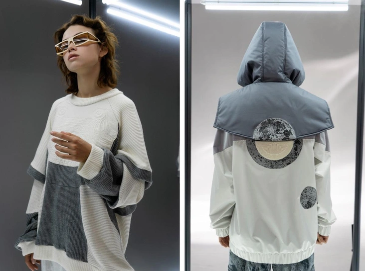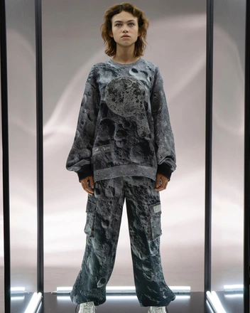 Почти все вещи потребовали много усилий: это серьезная работа с принтованием ткани, нанесением изображений Луны, которые имеют объемную текстуру и повторяют рельеф кратеров, футуристичные нашивки на верхней одежде и комбинезонах. Коллекция «Лунная база» — результат очень серьезной работы всей нашей команды.