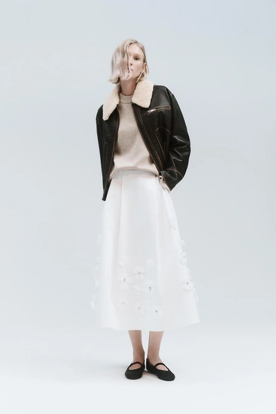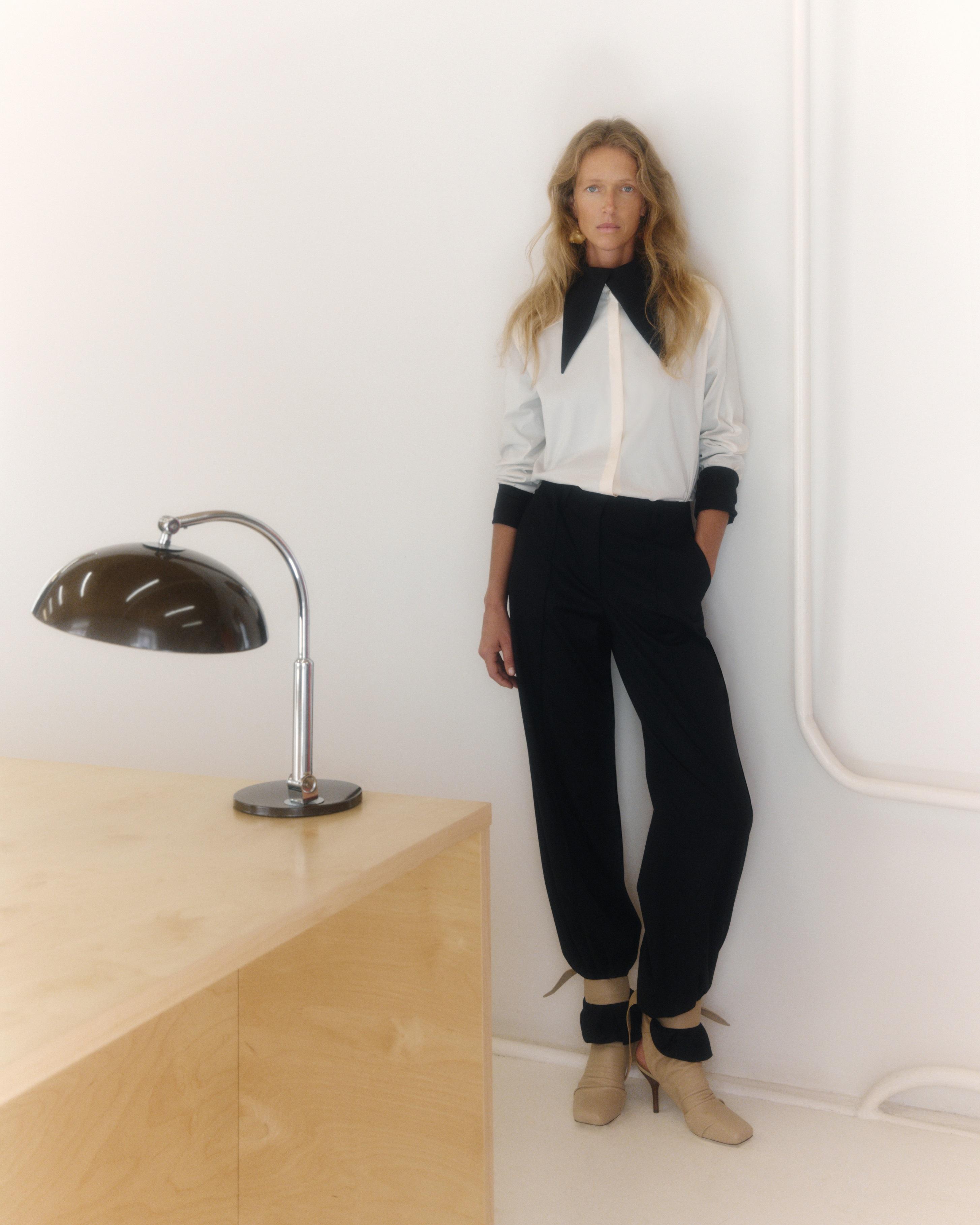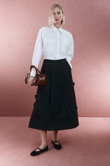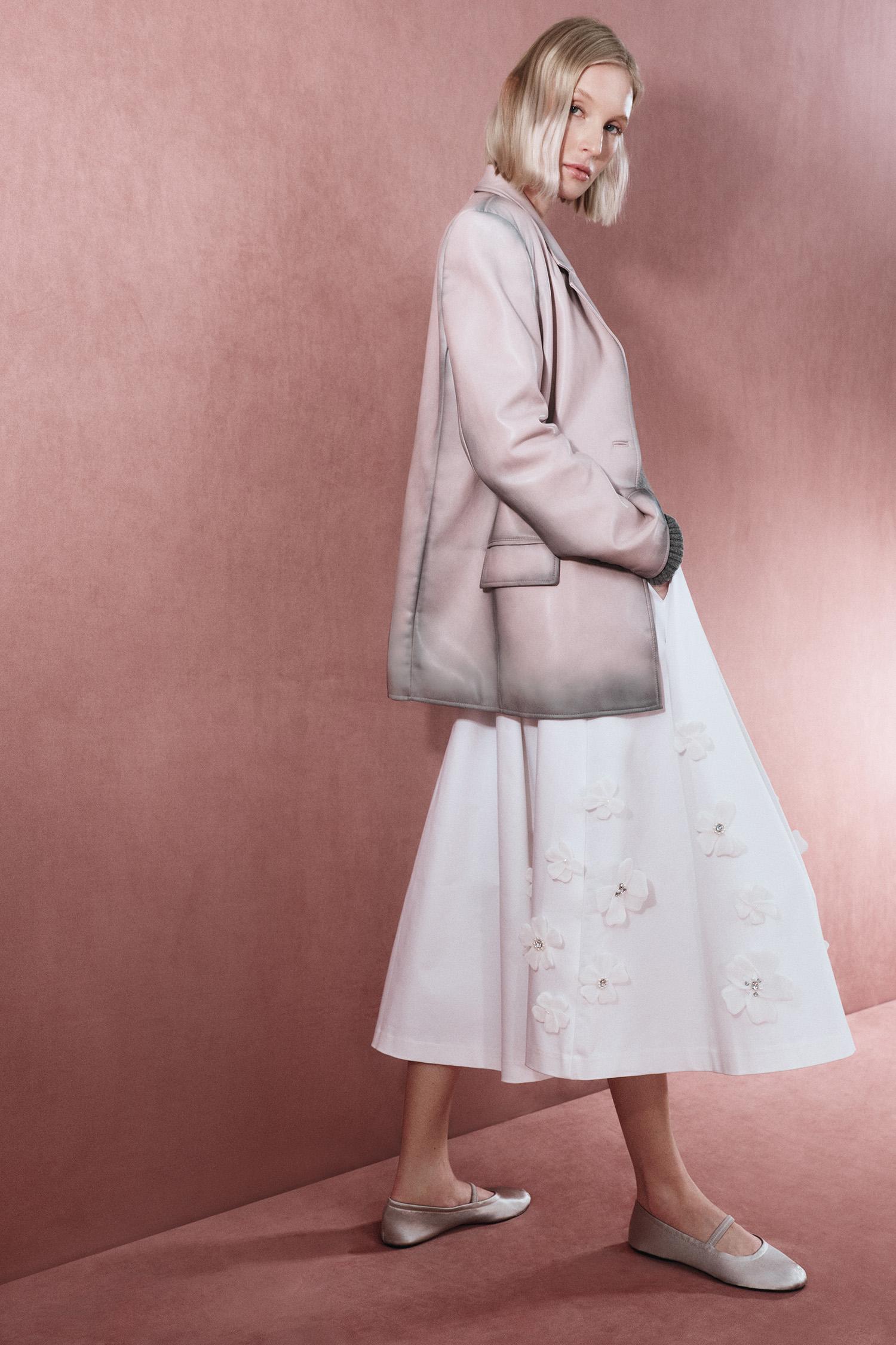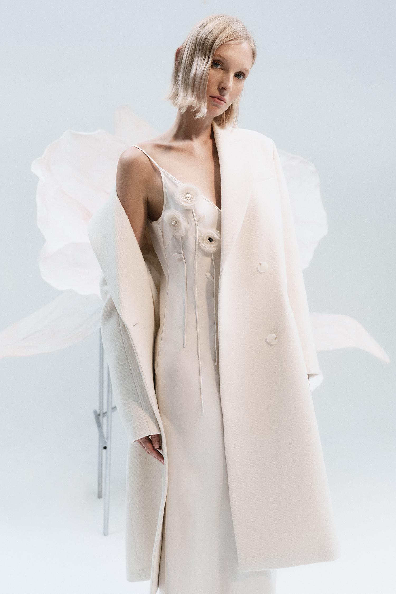 Лаконичные свитеры из кашемира и шерсти с круглым и V-образным вырезом станут базой гардероба на холодный сезон. Знаковая модель новой коллекции — двубортное оверсайз пальто в бежевом и черном цветах. Благодаря высокому качеству материала и универсальному крою оно прослужит не один сезон. Также в линии будут представлены юбки, брюки, блейзер, жилет и куртка из натуральной кожи. Заметная часть новинок декорирована вручную объемными цветами: юбки мини и миди, белая рубашка, черное платье мини и белое атласное миди в бельевом стиле. Розовый блейзер из гладкой экокожи также был окрашен вручную, для того чтобы добиться эффекта винтажной потертости.