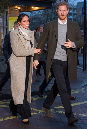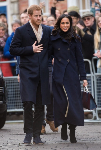 Любимым приемом Гарри и Меган стал собственный вариант double dressing: принц и его невеста теперь появляются в синонимичных нарядах. Так, во время визита в Ноттингем, пара была в пальто глубокого темно-синего цвета.