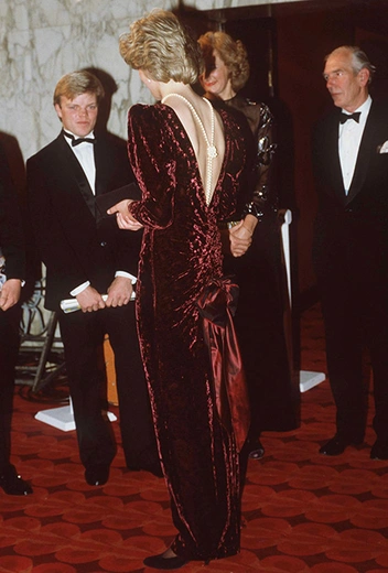 Тяжелый бархат бордового оттенка, который уже давно стал элементом королевского стиля, сделает благородным любой образ — даже если в нем припрятана провокационная деталь, как на платье Catherine Walker с открытой спиной. Такой наряд Ее Высочество продемонстрировала на премьере фильма «Назад в будущее» в 1985 году. А дополнительное внимание к вырезу она привлекла при помощи другого стильного приема: Диана часто носила нити жемчуга не спереди, а сзади, подчеркивая красоту спины.