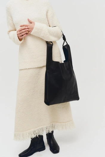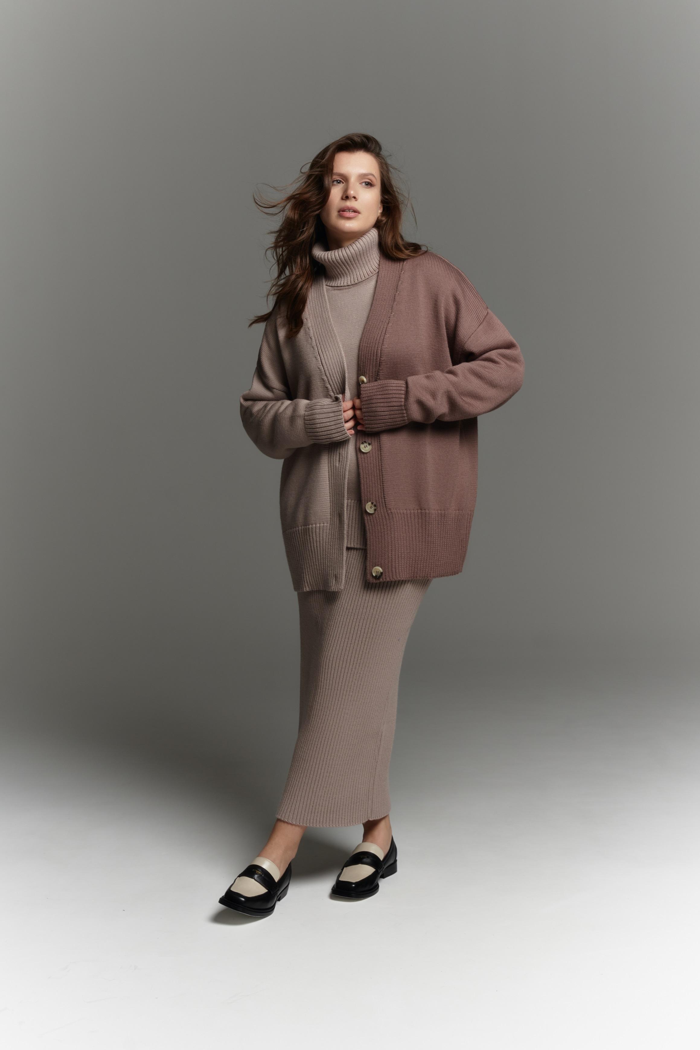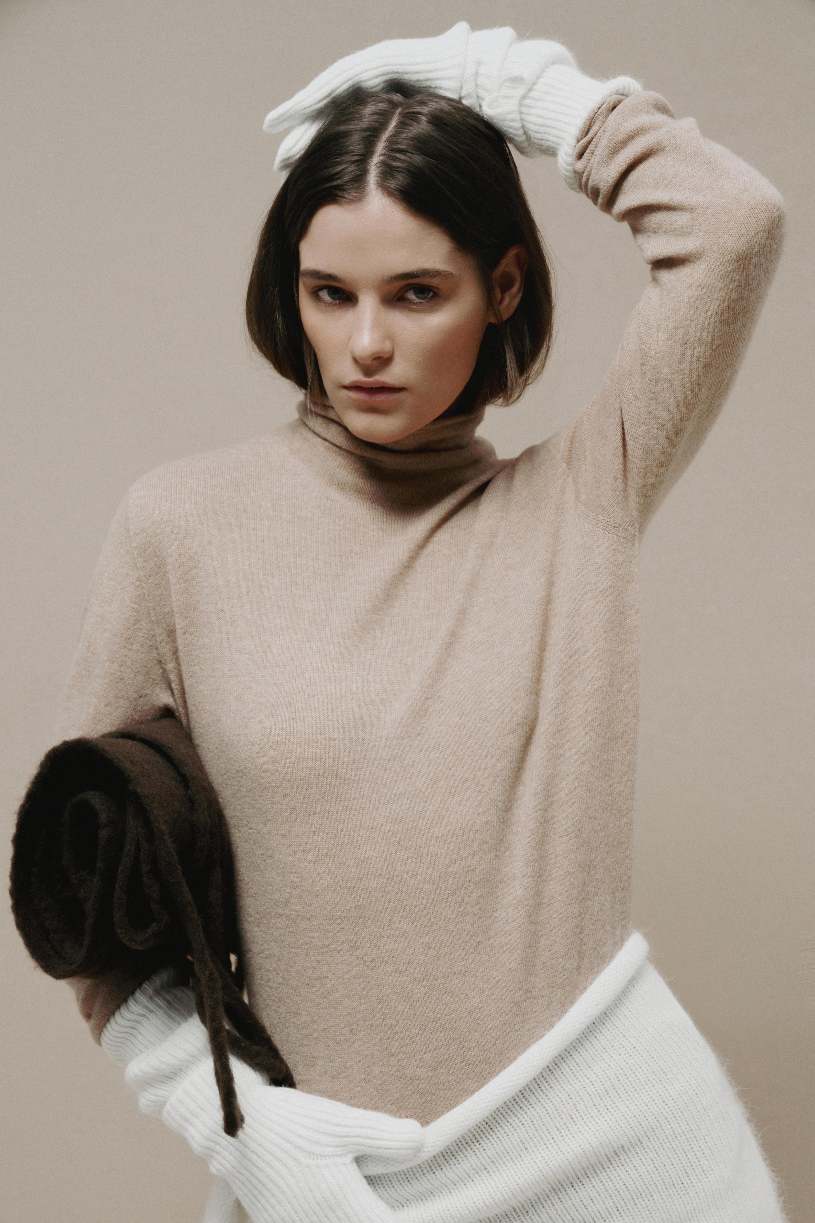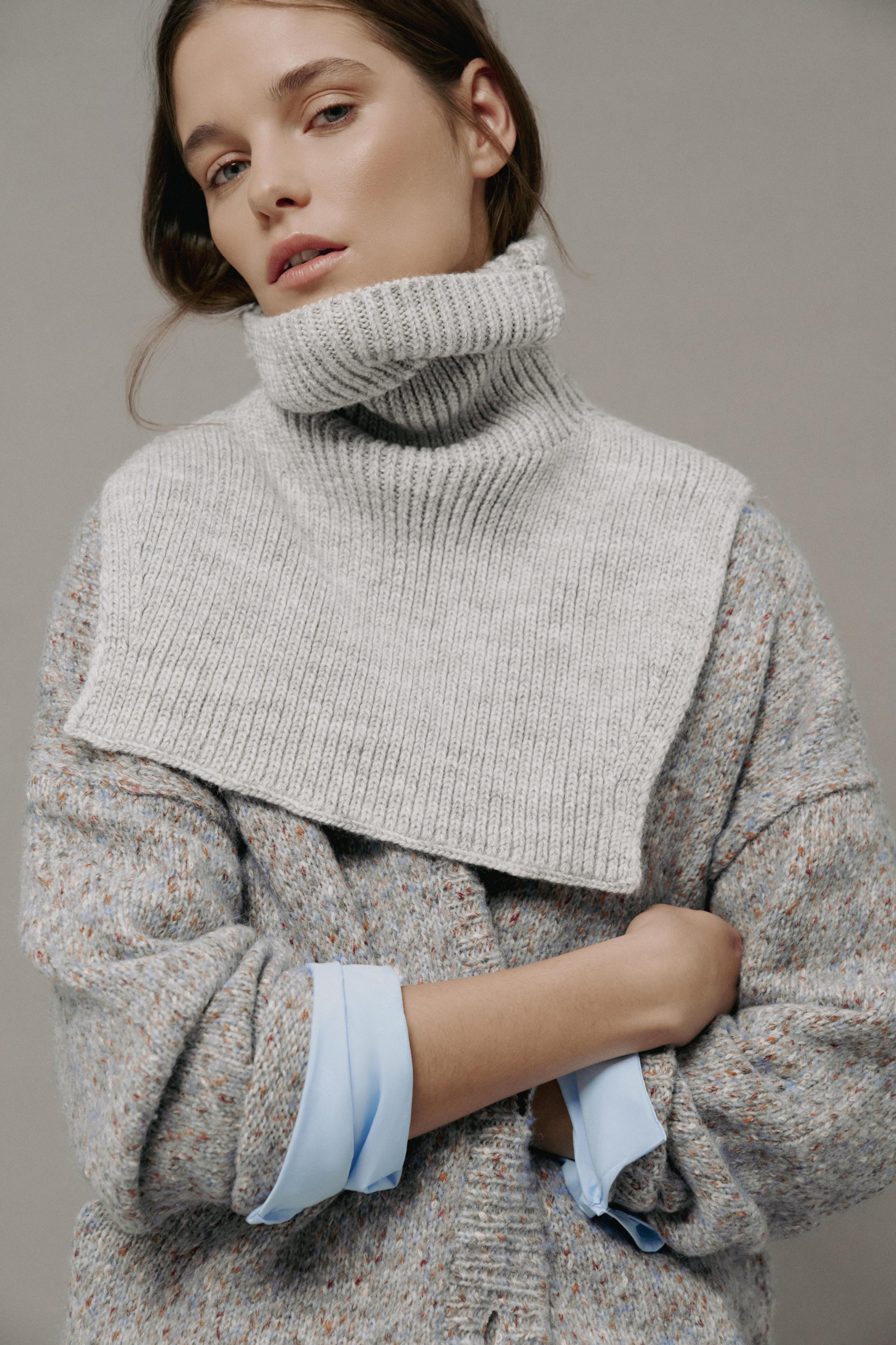 Модели новой коллекции можно сочетать друг с другом. На это же работает вариативность силуэтов (от прямого кроя до объемного) и рукавов (от рубашечного до реглана), а также цветовая палитра, где нейтральные оттенки (коричневый, бежевый, белый) разбавлены глубокими и яркими (зеленый, синий, красный). Собрать трикотажный тотал-лук помогают и вязаные аксессуары, которые вошли в коллекцию наряду с джемперами, свитерами, жакетами, юбками и платьями.