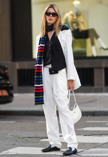 большой и длинный шарф можно надеть в один оборот вокруг шеи, а спереди пропустить кончики под пояс — визуально это удлинит силуэт и сделает фигуру стройнее;