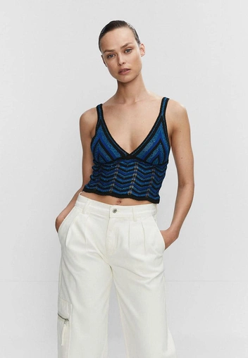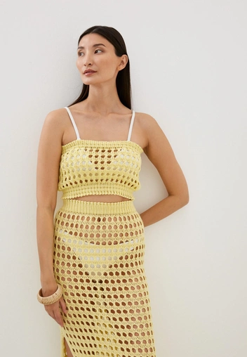 Именно вязаные изделия отсылают нас к гардеробу русалки — тренду mermaidcore, который пронизан отпускной эстетикой: кроше, рыбацкие сети, раковины с жемчугом и цвет морской волны. Для отдыха такой топ подойдет идеально, особенно если вы будете его сочетать с парео, завязанным в форме юбки на бедрах.