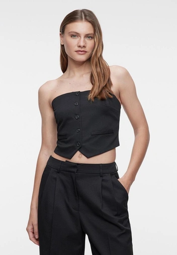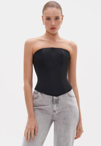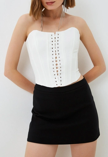 Для вечерних аутфитов выберите соблазнительный приталенный корсет без бретелей, который можно сочетать с прямыми брюками, мини-юбками и туфлями на каблуке. Для более повседневных и деловых образов подойдут костюмные изделия, которые не отличаются особой фактурностью и состоят из простых и свободных материалов. Они могут быть на широких бретелях или вовсе без них.
