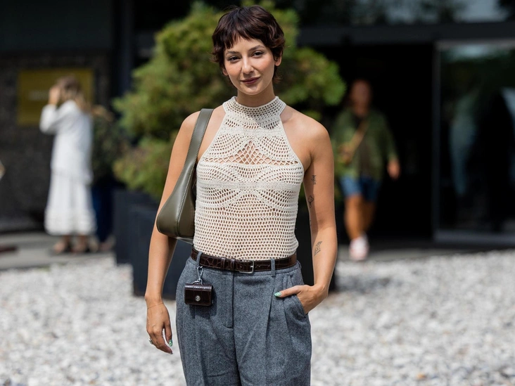 Вместе с бельевым стилем в моде прозрачные ткани, которые все чаще появляются в коллекциях брендов. Это могут быть вечерние ажурные топы, носить которые следует с юбками-карандашами и строгими брюками со стрелками (читайте также: Что такое стиль Y2K: тренд нулевых, актуальный и сегодня).