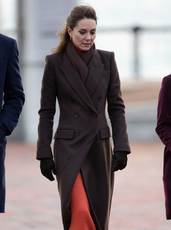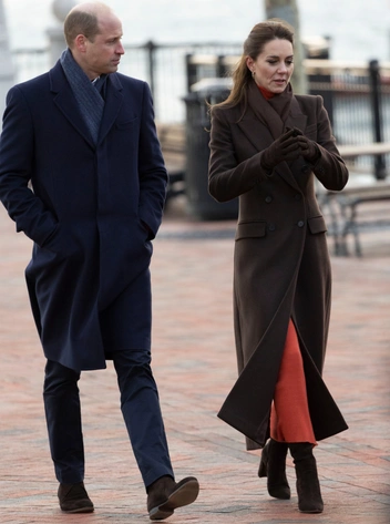 Кроме того, 1 декабря принц и принцесса Уэльские посетили набережную Восточного Бостона с мэром Мишель Ву и преподобной Мариамой Уайт-Хаммонд, начальником отдела окружающей среды, энергетики и открытого космоса Бостона, где Их Высочества должны были «узнать о значительных климатических проблемах, с которыми сталкивается сам город», и «увидеть, как меняется облик береговой линии Бостона, поскольку город борется с повышением уровня моря». Погода была прохладной и ветренной. На Кэтрин было коричневое двубортное пальто Alexander McQueen, из-под которого виднелся оранжевый комплект из водолазки и юбки Gabriela Hearst (материал — смесь кашемира и шелка). Коричневые сапоги Gianvito Rossi на Уэльской уже видели в ноябре. В тон им были подобраны перчатки Cornelia James из шерсти мериноса. На Кейт остались те же серьги Daniella Draper, что и ранее.