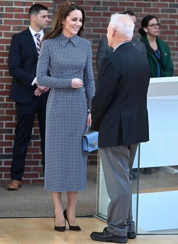 В третий день американского турне Кейт появилась в Центре развития ребенка Гарвардского университета в Бостоне в облегающем платье длины миди с длинными рукавами и отложным воротничком расцветки «гусиная лапка» в коричнево-голубой расцветке. Считается, что это кастомизированная версия модели без рукавов. Голубому цвету в рисунке соответствовала сумка Mulberry модели Harlow Satchel с золотистой фурнитурой, которую принцесса Уэльская несла за ручку, демонстрируя популярный среди королевских особ тренд.