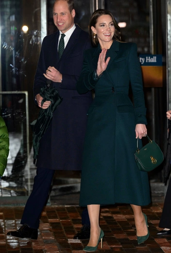 Для встречи с мэром Бостона Мишель Ву, а затем для открытия мероприятия Earthshot Prize в мэрии Бостона, состоявшихся в среду 1 декабря, Кейт выбрала темно-зеленое пальто Alexander McQueen, которое тоже уже было в ее гардеробе. Его дополнили замшевые лодочки Emmy Rebecca в зеленом цвете, зеленая сумка Mulberry модели Amberley Small Satchel и серьги Shyla Chunky модели Knot Baroque Pearl Earrings с крупными жемчужинами в барочном стиле.