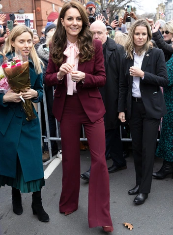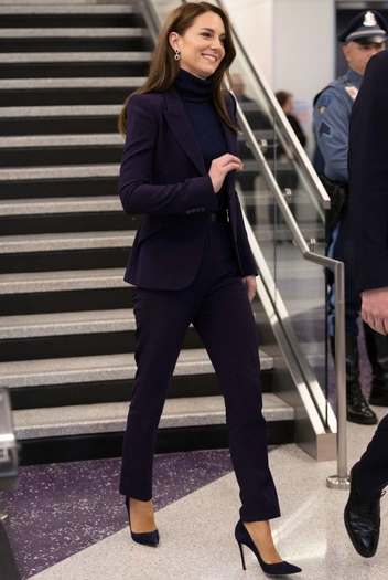Второй день тура также ознаменовался возвращением Кэтрин к ее любимому стилю — блузкам с «кошачьим» бантом. Розовый топ дополнил сливовый костюм принцессы, который, как заметили королевские поклонники, полностью совпадал с цветом свитера принца. В том же оттенке была выполнена и сумка Chanel модели Nouvelle Flap Bag с затейливой золоченой ручкой, с которой Кейт появлялась в Париже в 2017 году. Комплект дополнили еще одни остроносые туфли Gianvito Rossi — уже в сливовом оттенке.