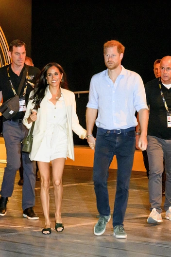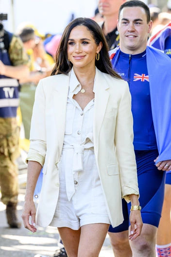 Во второй день турнира Меган и Гарри посетили баскетбольную площадку, где собрались бывшие военнослужащие, которые сегодня передвигаются на инвалидных колясках. Герцогиня примерила на черный топ белый блейзер-свитер с черной отделкой, который решила не застегивать на золотые пуговицы, чтобы создать более непринужденный образ. Короткие белые шорты Меган дополнила черным тонким поясом, а завершающим аксессуаром стали черно-бежевые туфли на плоской подошве.