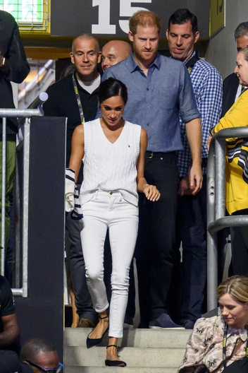 Немного позже Меган сменила наряд и прическу для большего удобства на соревнованиях по волейболу. Теперь на герцогине Сассекской можно было увидеть белый вязаный топ без рукавов, белые джинсы-скинни и черные замшевые туфли на плоской подошве. В руках поклонники заметили вязаный полосатый свитер с горлом — благодаря теплой погоде герцогине он так и не понадобился. Волосы Меган предусмотрительно собрала в хвост, придав им дополнительный объем на затылке.