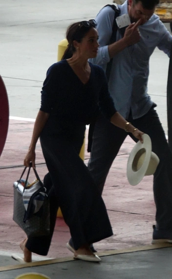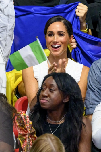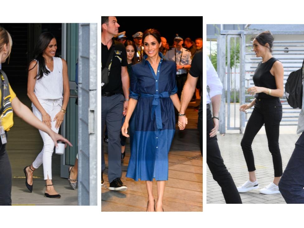 В этот же день, будучи уже на финале соревнований по плаванию, Меган изменила не только наряд, но и прическу. Ранее распущенные волосы герцогиня собрала сзади и оставила у лица только два слегка подкрученных локона, создавшие одновременно ощущение легкости и грациозности. Монохромный черный образ Сассекская создала при помощи джинсов-скинни и свитера-майки. Из аксессуаров герцогиня оставила золотые часы Tank Française, в которых появилась в аэропорту, и серьги.