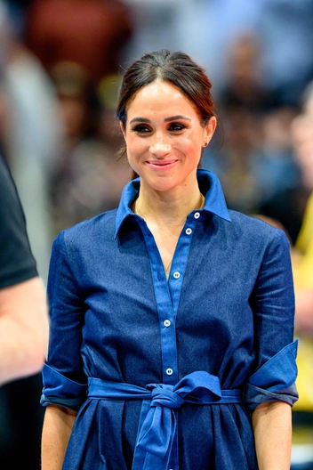 Позже на волейбольный матч Меган примерила сине-голубое платье-миди с воротником и тканевым поясом, создав сдержанный образ за счет строгих черных туфель из прошлого сезона и длинной подвески. Мягкий синий цвет платья герцогини подчеркнули маленькие серьги с кианитом.