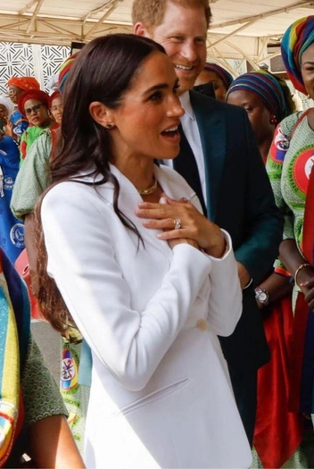 Уже днем Меган показала образ, который запросто может стать руководством «как подобрать идеальный брючный костюм». Но вообще, этот наряд висит в гардеробе Меган с 2018 года — более того, он так понравился герцогине, что она купила его не только в белом, но и в черном цвете (узнаем почерк Кейт Миддлтон). В тот день Меган и Гарри встречались с начальником штаба обороны Нигерии — так что официальный стиль был как никогда уместен.